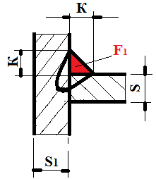 Поперечное сечение таврового соединения без разделки кромок без зазора, выполненного односторонним швом наклонным электродом или в симметричную «лодочку». | Fн = F1, мм2; Fн = 1/2×К2 , мм2 |