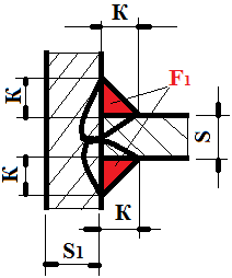 Поперечное сечение таврового соединения без разделки кромок без зазора, выполненного двусторонним швом наклонным электродом или в симметричную «лодочку». | Fн = F1, мм2; Fн = К2 , мм2 |