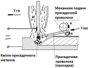 | Схема дуговой сварки в защитном газе неплавящимся вольфрамовым (W) электродом а – без присадки (может быть ручной и автоматической); б – с присадочной проволокой (с присадкой) (может быть ручной, механизированной и автоматической). Vсв – скорость сварки; Vпп – скорость подачи присадочной проволоки | |