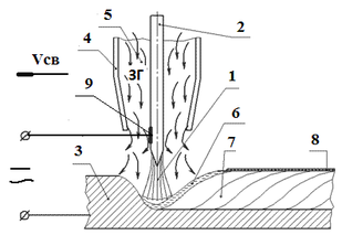 | Дуговая сварка в защитном газе плавящимся электродом - дуговая сварка плавящимся электродом, при которой используют электродную проволоку, а дугу и сварочную ванну защищают от атмосферы газом, подаваемым снаружи. Дуговая сварка в защитном газе плавящимся электродом может быть автоматической и механизированной |