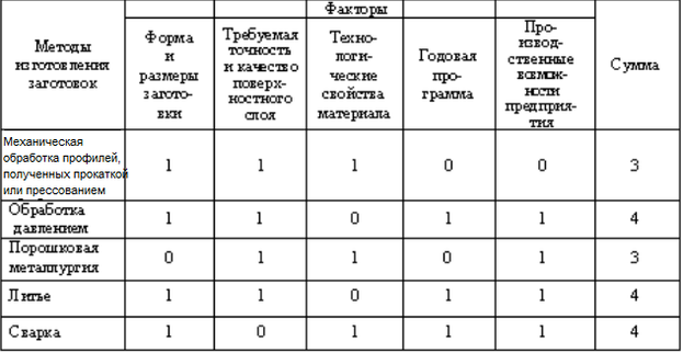 Каждый фактор в ней оценивают с помощью коэффициента удельного веса (0 или 1). Лучшим считают метод, набравший большую сумму коэффициентов. В том случае, когда ни у одного из рассмотренных методов получения заготовки нет явных преимуществ, проектируют несколько наиболее приемлемых вариантов изделия и технологических схем изготовления.