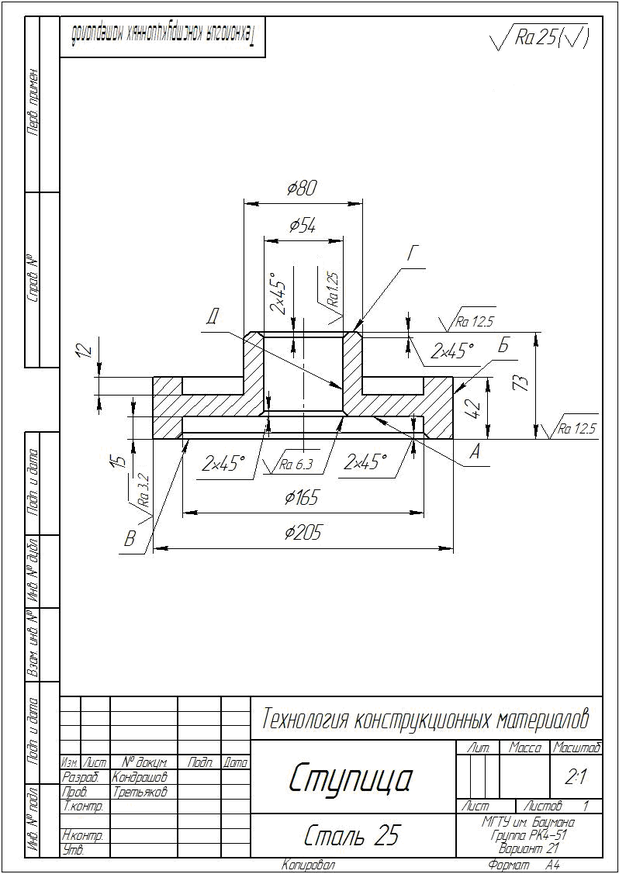 Материал – сталь 25, низкоуглеродистая имеет хорошую обрабатываемость резанием.