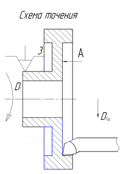 Расточить отверстие «А» 165 мм на глубину 15 мм. Инструмент: токарный проходной упорный резец. (рис. 10)