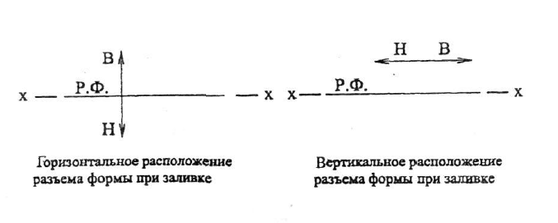 Положение отливки в форме при заливке обозначают заглавными буквами В (верх) и Н (низ), которые ставят у стрелок (рис.3.1).