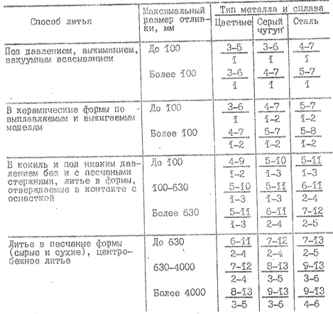 Классы точности размеров и ряды припусков на механическую обработку отливок для различных способов литья
