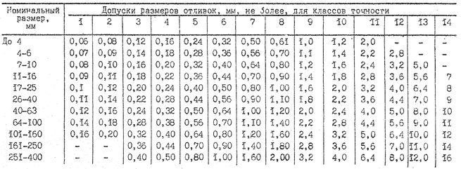 Допуски линейных размеров отливок (на сторону)