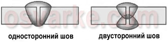 | По положению сварных швов относительно поверхности изделия сварные швы делятся на односторонние и двусторонние. Односторонний шов – шов, выполненный с одной стороны заготовки (односторонняя сварка). Двусторонний шов – шов, выполненный с обеих сторон заготовки (двусторонняя сварка). | ||||