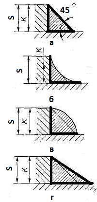 | По профилю поперечного сечения угловые швы делятся на: - нормальные (а) - катет шва принимается равным толщине листа (К=S); - вогнутые (б) - катет шва К= 0,8 S; - выпуклые (в)(нежелательны для угловых швов) ; - специальные (г) - профиль представляет неравнобедренный прямоугольный треугольник (один из катетов K=S). Вогнутые швы применяют в особо ответственных конструкциях при переменных нагрузках, так как вогнутость обеспечивает плавный переход от шва к основному металлу детали, благодаря чему снижается концентрация напряжений. Вогнутый шов повышает стоимость соединения, так как требует глубокого провара и последующей механической обработки для получения вогнутости Выпуклые - вызывают повышенную концентрацию напряжений. Наиболее приемлем нормальный профиль углового шва. Специальные швы применяют при переменных нагрузках, так как их применение значительно снижает концентрацию напряжений. | ||||