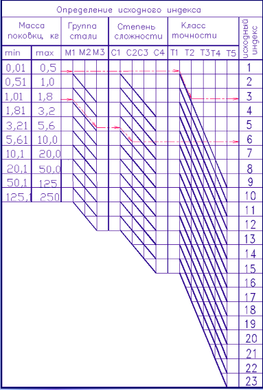 Аналогично поступаем со степенью сложности поковки (С) и классом точности (Т). Если группа сложности С1 и класс точности Е1, то опускаться на следующую строку не надо. При остальных группах и классах необходимо опускаться на более низкую строку по наклонной линии до пересечения с вертикальной линией соответствующего класса (Т). Пройдя до конца горизонтальной линии до столбца «Исходный индекс», определяем исходный индекс.