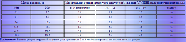 Наименьшие радиусы закруглений внешних углов штампованных поковок