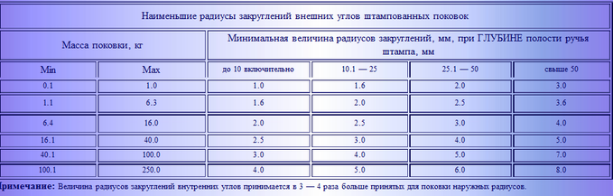 Минимальные значения радиусов закруглений внешних углов поковки