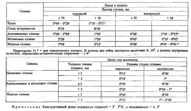 Следует помнить, что величины формовочных уклонов, приведенные в таблицах 3.5 и 3.6, на чертеже детали не указывают и вычерчивают деталь без уклонов, за исключением чертежей крупногабаритных отливок, где целесообразно указывать уклоны или же предпочтительнее предусматривать конструктивные уклоны (1:5, 1:10, 1: 20, 1:50), превышающие формовочные уклоны (в этом случае формовочные уклоны не выполняют).