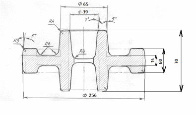 Величина радиусов закруглений определяется массой (величиной) поковки и глубиной соответствующей полости штампа. Масса нашей поковки попадает в диапазон 6,4-16 кг, при этом глубина полости штампа на диаметре 176 и 256 мм составляет 37.75 мм, а на диаметре 65 мм – 53 мм. В соответствии с таблицей 2 наименьшие значения радиуса закруглений внешних углов штампованных поковок при глубине штампа менее 25 мм составляет 2,5 мм, а при глубине более 50 мм – 4 мм. Назначаем значения внешних радиусов закруглений на диаметрах 212 и 65 мм – 3 мм, а на диаметре 65 мм – 4 мм. Все внутренние радиусы закруглений назначаем 8 мм (в 2 раза больше внешних).