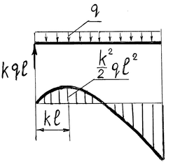 Примечание: В балках типа, изображенного на рисунке, расстояние до экстремума равно коэффициенту k при «подпирающей» силе, а сам экстремум равен половине квадрата этого коэффициента (Мx*=