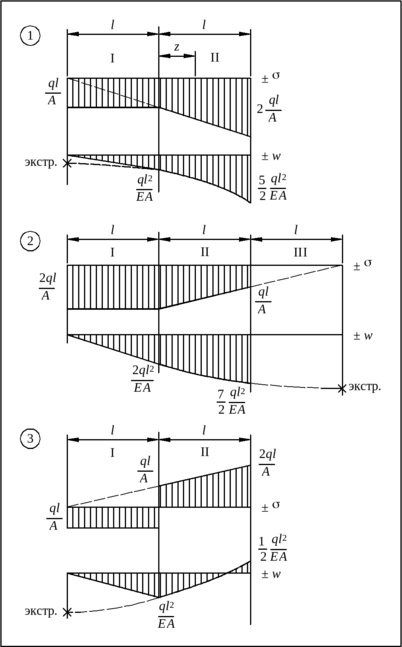 Эта эпюра подобна эпюре N, только появляется дополнительный скачок в месте резкого изменения площади сечения. Эпюра на участке с распределенной нагрузкой пересекает ось там, где будет экстремум на эпюре w.