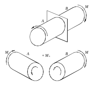 Применяем метод сечений по участкам. Рассматриваем часть бруса от свободного конца до сечения. В разрезе прикладываем положительный крутящий момент Мк. Если смотреть со стороны сечения, то положительный крутящий момент направлен против часовой стрелки.