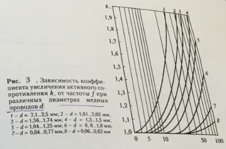 По графику находим, что для данной частоты (f = 20кГц) и сечения провода K*: