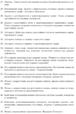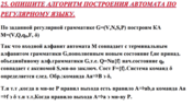 | Поиск в ширину рассматриваем только для ориентированного графа. Вход. Граф G=(V,E), заданный списками смежности; v0 — начальная вершина (не обязательно первый элемент массива лидеров). Выход. Массив M меток вершин, где каждая метка равна длине пути от v0 до v. 0. Очередь Q положить пустой (Q=∅). Все вершины пометить как недостижимые из вершины v0, присваивая элементам массива M значение +∞ (M[vi]=+∞, i=1..N). Стартовую вершину v0 пометить номером 0, т.е. длину пути от стартовой вершины v0 до самой себя положить равной 0 (M[v0]=0). Поместить вершину v0 в очередь Q. Перейти на шаг 1. 1. Если очередь Q не пуста (Q≠∅), то из "головы" очереди извлечь (с удалением из очереди) вершину u и перейти на шаг 2. Если очередь пуста, перейти на шаг 3. 2. Если список смежности L(u) вершины u пуст, вернуться на шаг 1. Если список смежности L(u) вершины и не пуст, для каждой вершины w из списка смежности, где M[w]=+∞, т.е. вершины, которую еще не посещали, положить длину пути из стартовой вершины v0 до вершины w равной длине пути от v0 до вершины u плюс одна дуга (L[w]=M[u]+1), т.е. отметить вершину w и поместить ее в очередь Q. После просмотра всех вершин списка смежности L(u) вернуться на шаг 1. 3. Распечатать массив M. Закончить работу. | Алфавит – произвольное непустое конечное множество V={a1 ,…,an }, элементы которого называют буквами или символами. Словом или цепочкой в алфавите V называют произвольный кортеж из множества VК (К-ой декартовой степени алфавита V) для различных К=0, 1, … . Длина слова – число компонент кортежа. Языком в алфавите V называется произвольное подмножество множества V*. Множество всех языков в алфавите V, т.е. 2 V*, есть булеан счетного множества и имеет мощность континуума. Операции над языками: Соединение (конкатенация) слов: для х=х(1) х(2)… и у= у(1) у(2)… соединение ху = х=х(1) х(2)…у(1) у(2)… . Из определения следует, что конкатенация ассоциативна и множество V* всех слов в алфавите V образует моноид. Конкатенация языков L1 и L2 – язык L1L2, состоящий из всех возможных соединений слов ху, где слово хL1, а yL2 . Итерация языка L - объединение всех его степеней. L* = Ln, где n = 0…. L(V)=(2V∗,∪,⋅,∅,{λ}) | Регулярные операции-операции объединения,соединения,итерации. L1+L2,L1*L2,L1*-рег. языки в V. В замкнутом полукольце L(V) всех языков в алфавите V рассмотрим подалгебру, порожденную множеством, которое состоит из пустого языка, языка {λ}, всех языков {a}, a∈V (каждый из которых содержит единственную однобуквенную цепочку a), и замкнутую относительно итерации. Эта подалгебра, обозначаемая R(V), есть полукольцо с итерацией. Оно играет важнейшую роль в теории формальных языков. Его называют полукольцом регулярных языков. Рег языки: 1) пустое множество ∅, множество {λ} (состоящее из одной пустой цепочки) и множество {a} для каждого a∈V считаем регулярным языком в алфавите V; 2) если известно, что P и Q — регулярные языки в алфавите V, то к множеству регулярных языков в алфавите V следует добавить объединение P∪Q и соединение PQ; 3) если известно, что P — регулярный язык в алфавите V, то к множеству регулярных языков в алфавите V следует добавить его итерацию P∗; 4) никаких других регулярных языков, кроме определенных в пунктах 1-3, не существует. Мощность множества регулярных языков равна 2V . | рег языки - см вопрос 35 | ||
