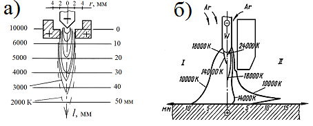 Рис. 2. Распределение температуры плазменной струи (а) по радиусу r и по длине l, распределение температур в обычной (I) и плазменной (II) дугах (б).
