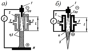 Плазменной дугой принято называть сжатый дуговой разряд с интенсивным плазмообразованием. В зависимости от вида положительного электрода (анода) плазменная дуга может быть прямого и косвенного действия. В первом случае анодом служит изделие (рис. 1, а). Осуществление процесса сварки плазменной дугой прямого действия принято называть плазменно-дуговым. Если анодом служит сопло, которое конструктивно может совпадать с каналом плазменной горелки, то источник теплоты становится независимым от изделия со струёй плазмы, выделенной из столба дуги в виде факела (рис. 1, б). Такую дугу называют дугой косвенного действия или просто плазменной струёй. В этом случае передача теплоты к изделию осуществляется теплопроводностью, конвекцией и излучением плазмы. При плазменно-дуговом нагреве (сжатой дугой) к перечисленным механизмам теплопередачи добавляется передача энергии заряженными частицами, движущимися в электрическом поле.