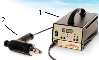 Рис. 3. Общий вид аппарата для плазменной обработки материалов Plazarium SP20: 1 – Источник питания S-20; 2 – Горелка плазмотрон Т-20.