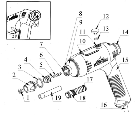Рис. 4. 1- Сопло, 2 - Корпус головки горелки, 3 - Прокладка уплотнительная 28x22x2, 4 – Завихритель, 5 - Вставка катода, 6 – Катод, 7 – Электрододержатель, 8 - Гнездо для прокладки уплотнительной (поз.З), 9 - Штуцер корпуса резервуара, 10 – Подвес, 11 - Горловина заливная, 12 – Пробка, 13 - Кольцо уплотнительное, 14 - Гайка ходовая, 15 - Кожух пластмассовый, 16 – Кабель, 17 - Насадка капиллярно-пористая, 18 – Нагреватель, 19 - Изолятор трубчатый, 20 - Кнопка «PUSH» механизма осевого перемещения катода, 21 - Пломба гарантийная