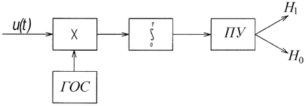 . Интеграл, который требуется вычислить, называют корреляционным. Таким образом, оптимальный обнаружитель состоит из коррелятора и порогового устройства – ПУ. Коррелятор, в свою очередь, состоит из перемножителя (X), интегратора и генератора