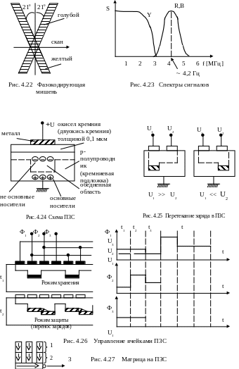 Двухкоординатная матрица является твердотельным аналогом передающей трубки. Для организации считывания в настоящее время наиболее удобным признается считывание с кадровым переносом (рис. 4.26), где 1 – секция накопления (фотоприемная секция), 2 – секция хранения (памяти). Выход 3 – секция переноса заряда (сдвиговый регистр). Накопленные в секции 1 заряды во время обратного хода кадра переносятся в секцию 2 – секцию памяти, поэтому в такой телевизионной системе передается предыдущий кадр изображения. Для этого во время обратного хода строки в секцию переноса 3 сносятся заряды очередной строки, а во время прямого хода они выносятся из матрицы как бы считывающей строкой.