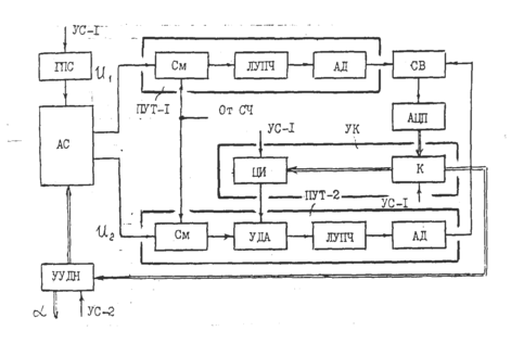 Угловой дискриминатор содержит два ПУТ и схему вычитания СВ. Сигнал СВ преобразуется в цифровую форму с помощью аналого-цифрового преобразователя АЦП. В каждый из ПУТ входят смеситель См, логарифмический усилитель промежуточной частоты ЛУПЧ и амплитудный детектор АД. В один из ПУТ включается управляемый дискретный аттенюатор УДА, служащий для изменения коэффициента усиления этого ПУТ. Нормировка сигналов, с помощью которой уменьшается влияние амплитудных флуктуаций входных сигналов на точность измерения угловых координат, осуществляется путем вычитания в СВ предварительно прологарифмированных в ЛУПЧ сигналов.