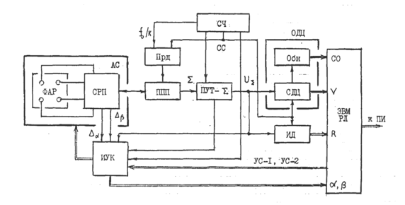 подается на обнаружитель движущихся целей ОДЦ, измеритель угловых координат ИУК и измеритель дальности ИД. Информация о скорости цели может сниматься с устройства селекции движущихся целей СДЦ при построении последнего на основе фильтрового метода. Обнаружитель Обн вырабатывает сигнал обнаружения СО. Этот сигнал, а также информация о дальности