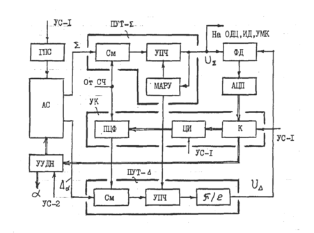 Угловой дискриминатор содержит два ПУТ и базовый детектор ФД. Сигнал ФД преобразуется в цифровую форму с помощью аналого-цифрового преобразователя АЦП. Устройство мгновенной регулировки усиления МАРУ служит для нормировки сигналов, с помощью которой уменьшается влияние амплитудных флуктуаций входных сигналов на точность измерения угловых координат.