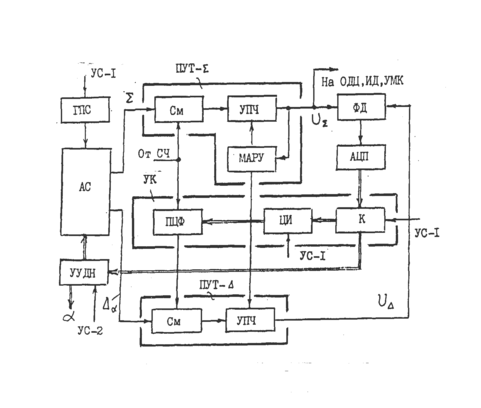 Угловой дискриминатор содержит два ПУТ и фазовый детектор ФД. Сигнал ФД преобразуется в цифровую форму с помощью аналого-цифрового преобразователя АЦП. Устройство мгновенной автоматической регулировки усиления МАРУ служит для нормировки сигналов, с помощью которой уменьшается влияние амплитудных флуктуации входных сигналов на точность измерения угловых координат.