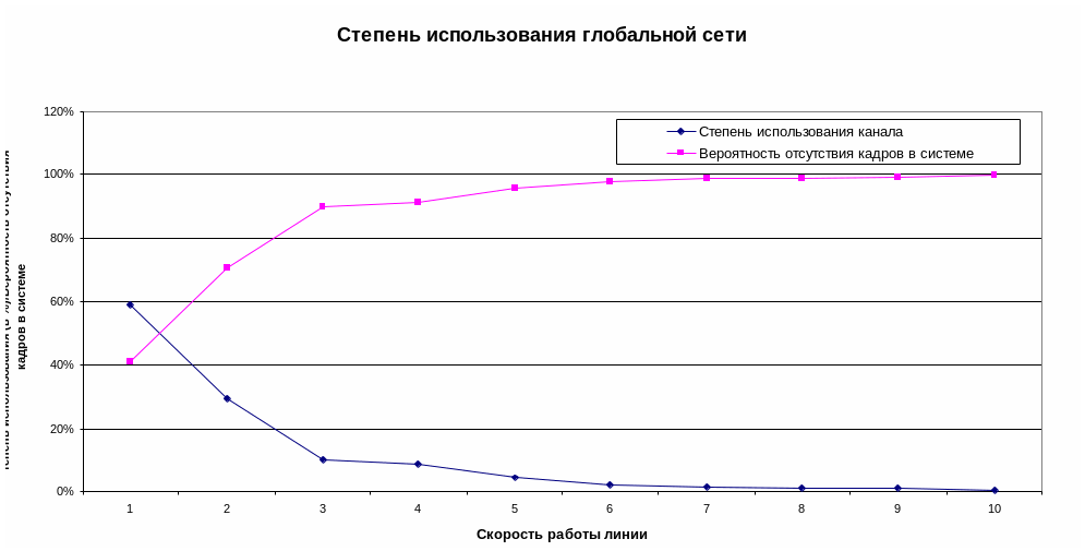 | Скорость линии бит/сек | Ожидаемое время обслуживания | Средняя скорость обслуживания | Степень использования канала | Вероятность отсутствия кадров в системе | Среднее число объектов (всего) | Среднее число объектов в очередях | Полное время ожидания | Время ожидания в очереди | |||