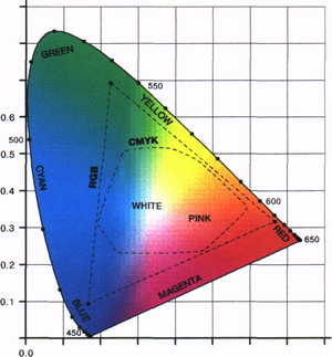 Основной субтрактивной цветовой моделью, применяемой в полиграфии, является CMYK. Она использует четыре чистых цвета: голубой (Cyan), пурпурный (Magenta), желтый (Yellow) и черный (blасk). Теоретически для получения черного цвета достаточно только трех исходных цветов — CMY (именно такая цветовая модель используется в простых цветных принтерах), но краски никогда не бывают идеальными, и при смешивании этих трех цветов, как правило, получается грязно-бурый. Для решения этой проблемы в цветовую модель и был добавлен чистый черный цвет, что увеличивает контрастность среди темных оттенков. По традиции, пришедшей из полиграфии, где интенсивность чистого цвета определяется процентом поверхности бумаги с нанесенной краской от общей площади (ср. с рис. 4), каждая цветовая составляющая пикселя может изменяться в диапазоне от 0 до 100. Тем не менее, иногда применяется модификация CMYK255 с 256 градациями для каждого канала.