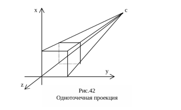 Рассмотрим изображение куба в одноточечной проекции (т.е. с одной точкой схода лучей) (см. рис.42).