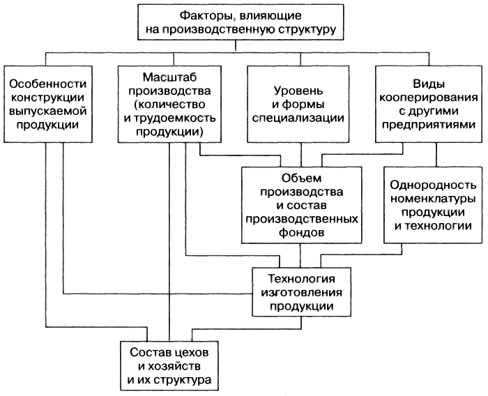 Состав подразделений предприятия, специализирующегося на производственной деятельности, определяется особенностями конструкции производимой продукции и технологии ее изготовления, масштабами производства, специализацией предприятия и сложившимися кооперированными связями. На рис. 10.1 представлена схема взаимосвязей факторов, определяющих производственную структуру предприятия.