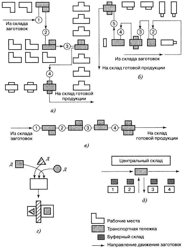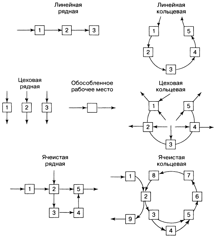 Рис. 11.3. Схемы расположения оборудования (рабочих мест) на участках с различной формой организации производства: