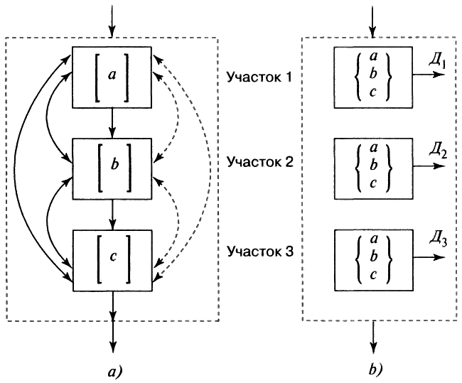 Структурная схема организации производственного процесса и возникающих при этом связей представлена на рис. 12.1. Здесь условно показано три участка, каждый из которых сформирован из станков одинакового технологического назначения. При такой структуре возникают многочисленные прямые и обратные связи между технологически специализированными участками для изготовления множества деталей Д.