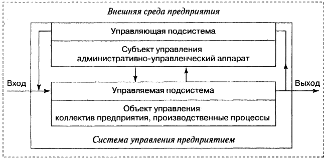 Предприятие как система состоит из двух подсистем: управляемой подсистемы - подсистемы, являющейся объектом управления, и управляющей подсистемы - подсистемы, осуществляющей управление в системе (рис. 22.1).