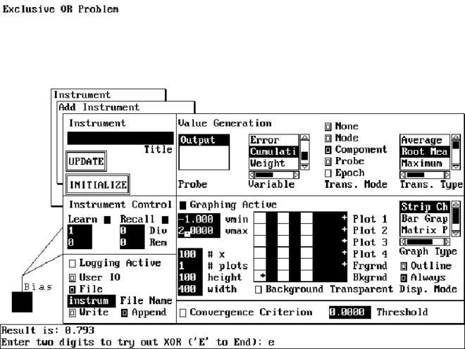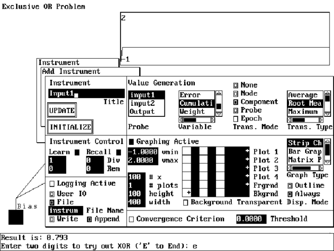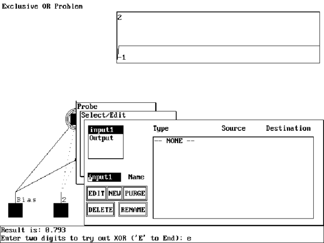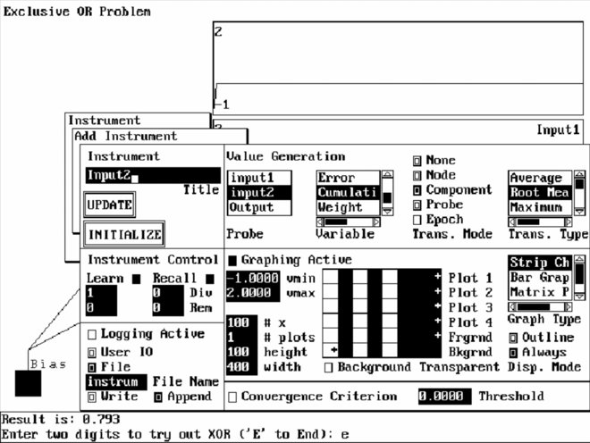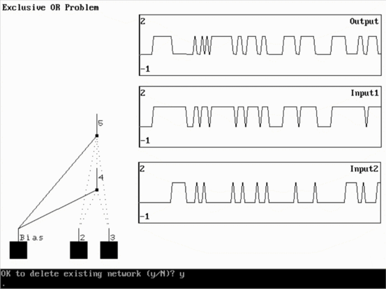Теперь, при вызове команды EXECUTE NETWORK / RECALL ALL, вы будете наблюдать работу сети в графической форме. Инструменты INPUT1 и INPUT2 отображают значение выходов процессорных элементов входного слоя в каждом цикле вызова, а инструмент OUTPUT - соответственно значение выходного процессорного элемента.
