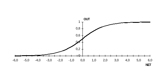 Эта функция, называемая сигмоидом, удобна, т.к. имеет простую производную, что используется при реализации алгоритма обратного распространения.