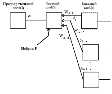 На рис. 4 показан процесс обучения для одного веса от нейрона р в скрытом слое j к нейрону q в выходном слое k.
