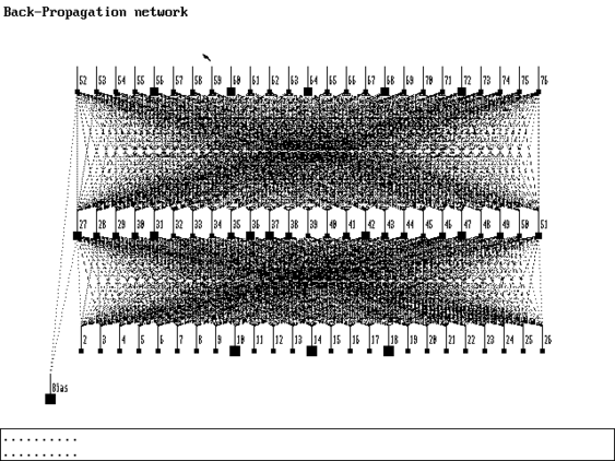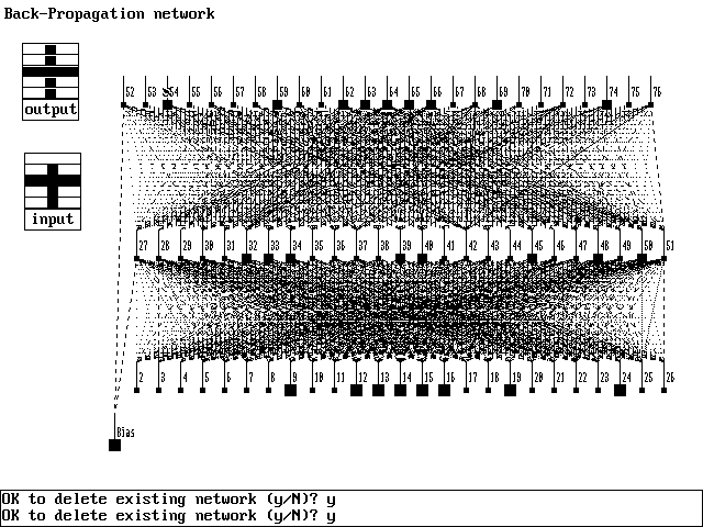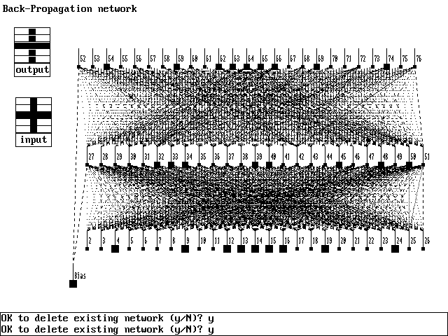 Чтобы построить сеть обратного распространения для распознавания четырех изображений, необходимо создать сеть из 75 нейронов – по 25 в трех слоях: входном, скрытом и выходном. Для этого можно воспользоваться меню Instanet (bkpstd –стандартная сеть обратного распространения).