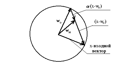 где wн- новое значение веса, соединяющего входную компоненту х с выигравшим нейроном; wc- предыдущее значение этого веса; - коэффициент скорости обучения, который может варьироваться в процессе обучения. Каждый вес, связанный с выигравшим нейроном Кохонена, изменяется пропорционально разности между его величиной и величиной входа, к которому он присоединен. Направление изменения минимизирует разность между весом и его входом. На рис. 2 этот процесс показан геометрически.