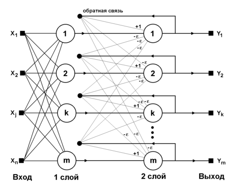 Эта формула демонстрирует стремление к состоянию, когда только один ПЭ в слое активен: этот ПЭ единственный, имеющий максимальное начальное состояние. Слой категорий соответственно связан с выходным слоем через соединения с фиксированными весовыми коэффициентами, равными 1.