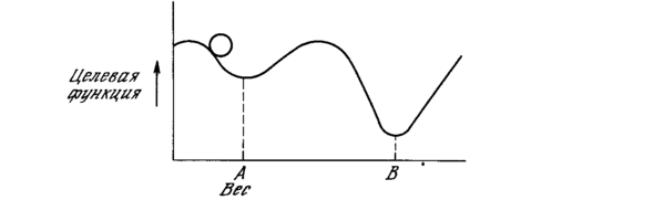 Этот процесс стремится минимизировать целевую функцию, но может попасть, как в ловушку, в неудачное решение. На рис. 5.2 показано, как это может иметь место в системе с единственным весом. Допустим, что первоначально вес взят равным значению в точке А. Если случайные шаги по весу малы, то любые отклонения от точки А увеличивают целевую функцию и будут отвергнуты. Лучшее значение веса, принимаемое в точке В, никогда не будет найдено, и система будет поймана в ловушку локальным минимумом, вместо глобального минимума в точке В. Если же случайные коррекции веса очень велики, то как точка А, так и точка В будут часто посещаться, но то же самое будет иметь место и для каждой другой точки. Вес будет меняться так резко, что он никогда не установится в желаемом минимуме.