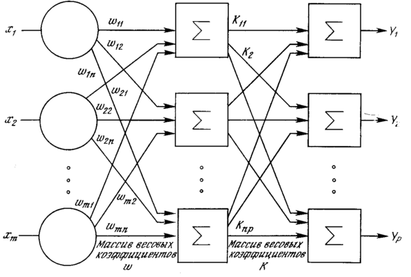 Многослойные сети могут образовываться каскадами слоев. Выход одного слоя является входом для последующего слоя. Подобная сеть показана на рис. 1.6 и снова изображена со всеми соединениями.