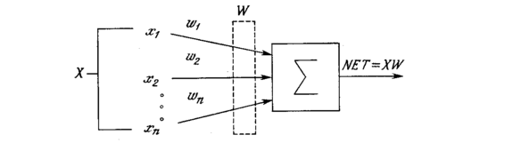 Искусственный нейрон имитирует в первом приближении свойства биологического нейрона. На вход искусственного нейрона поступает некоторое множество сигналов, каждый из которых является выходом другого нейрона. Каждый вход умножается на соответствующий вес, аналогичный синаптической силе, и все произведения суммируются, определяя уровень активации нейрона. На рис. 1.2 представлена модель, реализующая эту идею. Хотя сетевые парадигмы весьма разнообразны, в основе почти всех их лежит эта конфигурация. Здесь множество входных сигналов, обозначенных x1, x2,…, xn, поступает на искусственный нейрон. Эти входные сигналы, в совокупности обозначаемые вектором X, соответствуют сигналам, приходящим в синапсы биологического нейрона. Каждый сигнал умножается на соответствующий вес w1, w2,…, wn, и поступает на суммирующий блок, обозначенный Σ. Каждый вес соответствует «силе» одной биологической синаптической связи. (Множество весов в совокупности обозначается вектором W.) Суммирующий блок, соответствующий телу биологического элемента, складывает взвешенные входы алгебраически, создавая выход, который мы будем называть NET. В векторных обозначениях это может быть компактно записано следующим образом: