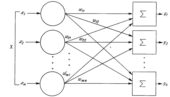 Хотя один нейрон и способен выполнять простейшие процедуры распознавания, сила нейронных вычислений проистекает от соединений нейронов в сетях. Простейшая сеть состоит из группы нейронов, образующих слой, как показано в правой части рис. 1.5. Отметим, что вершины-круги слева служат лишь для распределения входных сигналов. Они не выполняют каких- либо вычислений, и поэтому не будут считаться слоем. По этой причине они обозначены кругами, чтобы отличать их от вычисляющих нейронов, обозначенных квадратами. Каждый элемент из множества входов Х отдельным весом соединен с каждым искусственным нейроном. А каждый нейрон выдает взвешенную сумму входов в сеть. В искусственных и биологических сетях многие соединения могут отсутствовать, все соединения показаны в целях общности. Могут иметь место также соединения между выходами и входами элементов в слое. Такие конфигурации рассматриваются в гл. 6.