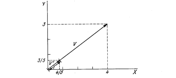 Уравнение (4.6) обобщает хорошо известный случай двух измерений, когда длина вектора равна гипотенузе прямоугольного треугольника, образованного его х и у компонентами, как это следует из известной теоремы Пифагора. На рис. 4.2а такой двумерный вектор V представлен в координатах х-у, причем координата х равна четырем, а координата y – трем. Квадратный корень из суммы квадратов этих компонент равен пяти. Деление каждой компоненты V на пять дает вектор V с компонентами 4/5 и 3/5, где V’ указывает в том же направлении, что и V, но имеет единичную длину.